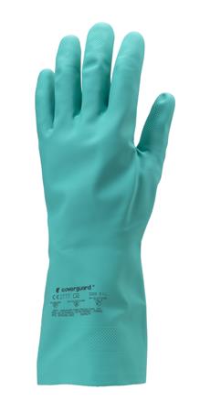 Védőkesztyű mikroorganizmusok elleni védelemel. -anyaga: zöld akrilonitril-pamutbolyhozott belső-sav-, lúg-, olaj-, zsír-, és vegyszerálló-csúszás ellen érdesített tenyér-0,38 mm vastag-hosszúság: 32 cm-CE minősítés-méret: 7/S